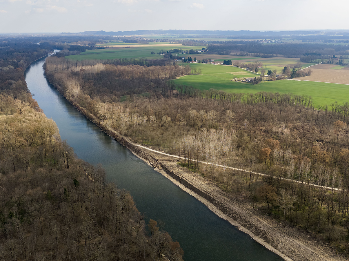 At Konjišče 2 on the border section of the Mura in the Municipality of Apače, 1.1 kilometres of bank reinforcement were removed and a new passive protection line was relocated 100–130 metres inland. This gives the river more space for natural development and improves conditions for 43.4 hectares of floodplain forest habitats. The measure is one of the largest river restoration works in the region and particularly important on this highly regulated stretch of the Mura. Together with earlier works in Slovenia and Austria, around four kilometres of the riverbed have now been continuously restored along this section.