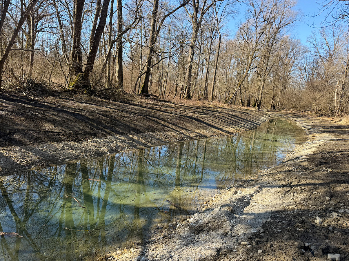 At Benica in the Municipality of Lendava, one of the longest side channels on the Slovenian Mura was restored. In recent years, sediment deposits and debris had increasingly restricted inflow from the Mura into the nearly 2 km long side channel. Around 8,056 m³ of sediment were removed and the inlet and initial section of the channel were deepened, helping to restore water inflow even at lower water levels. This strengthens the connection between the river and its floodplain and improves hydrological conditions in the side channel and surrounding forests. Overall, the measure improves natural conditions across 44 hectares of floodplain forest and 4 hectares covered by water.